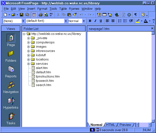 1. Open FrontPage2000 ("Start" button to "Programs" folder, Frontpage icon will be below the subfolders.) You will have a screen which looks like the one below: