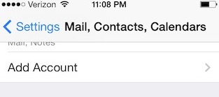 3. In the Mail / Mail, Contacts, Calendars settings menu, scroll down below any existing accounts, and click "Add Account".