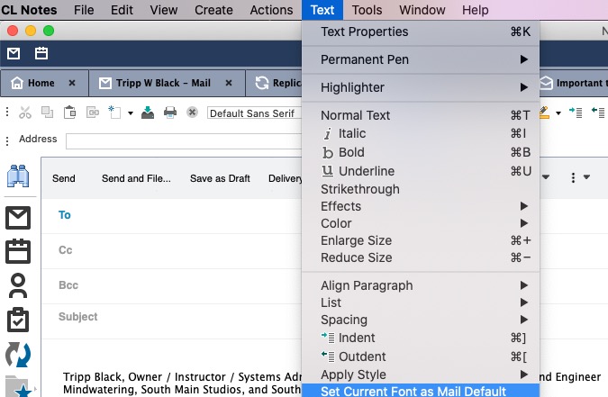 4. From the top menu,click Text, near the bottom of the Text options, choose the one, Set Current Font as Default Mail.