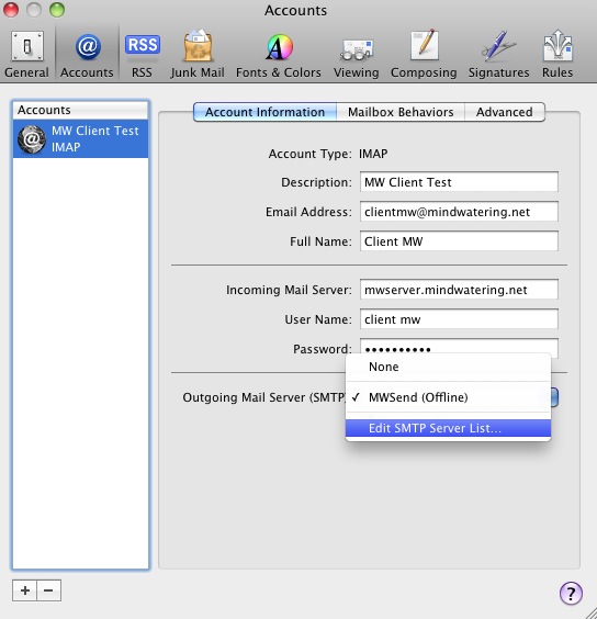 Went through the wizard for IMAP setup to Mindwatering server. After setup you find that mail will not send or takes forever.