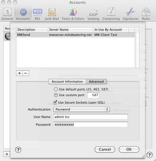 You may or may not see the message of an invalid username or password. For some reason, we have noticed that the Outgoing Mail Server (SMTP) entry's setup has the sending password empty instead of populated.