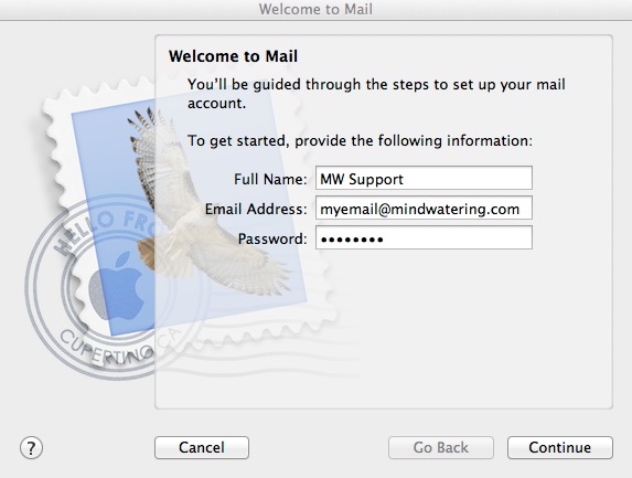 If you are using OS X 10.8, and get a message that the SMTP server is not responding, deselect the checkbox option Use only this server and click Continue again. You will have an extra screen to complete. We are working around a bug in the application. (It actually doesn't seem to matter if you start out selected or not selected for this box - it fails. So you toggle the selection and continue to get to the next screen.)