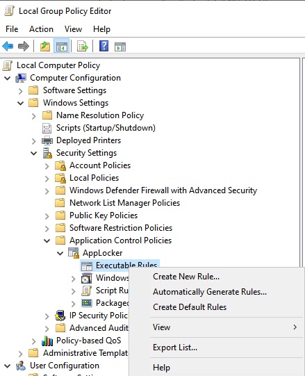 Once in AppLocker, right click Executable Rules and add a new rule.