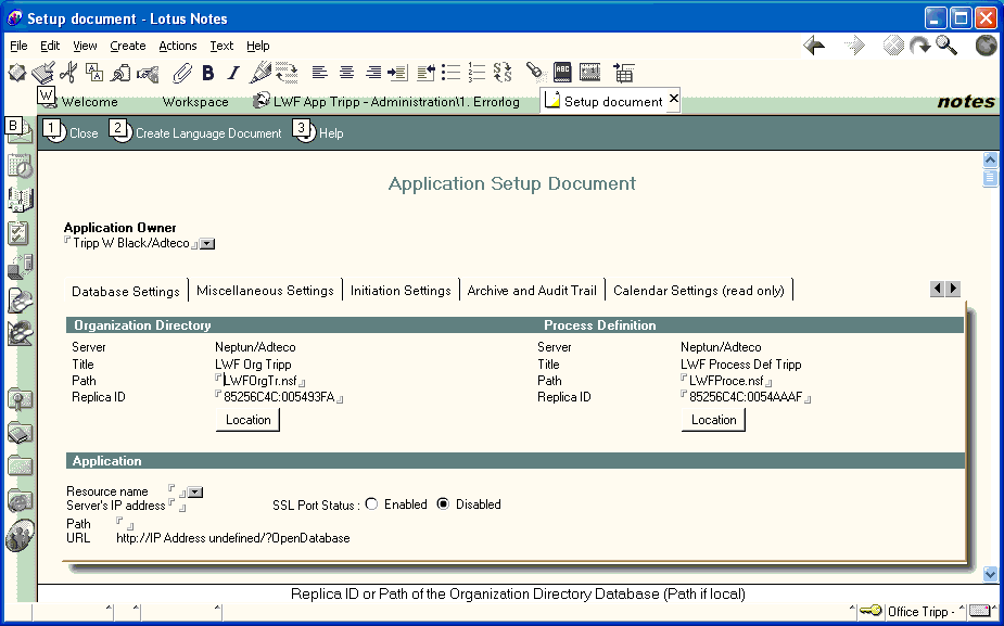 In the Database Settings tab, complete the two sections specifying the organization and the processes design databases using the "Location" buttons.