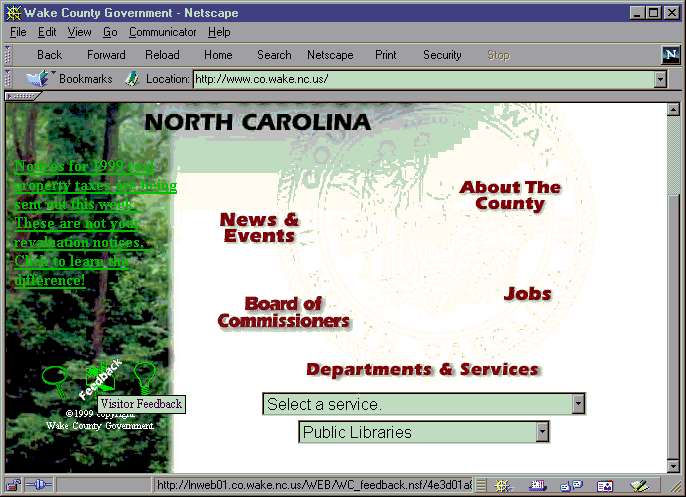 The following image shows what happens when the user's cursor runs over the feedback icon in the Wake County Home Page. A javascript rollover causes one effect, but the text in the box is caused by the Alt tag.